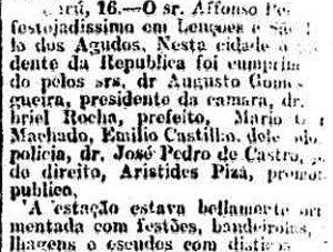 AO LADO: A parada nas estações de Agudos e de Lençois feitas pelo trem da comitiva de Afonso Pena que inaugurava diversas estações na região (O Estado de S. Paulo, 17/02/1908). |