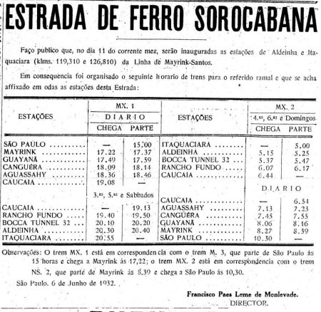 ACIMA: Em junho de 1932, o anúncio do prolongamento da Mairinque-Santos até Itaquaciara, abrindo também a estação de Aldeinha. Notar tamcém a abertura de duas estações ou paradas que pouco duraram (Rancho Fundo e Bocca do Tunel 32) (O Estado de S. Paulo, 9/6/1932).