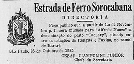 ACIMA: Mudança do nome da estação em 1935 (Correio de S. Paulo, 29/10/1935).