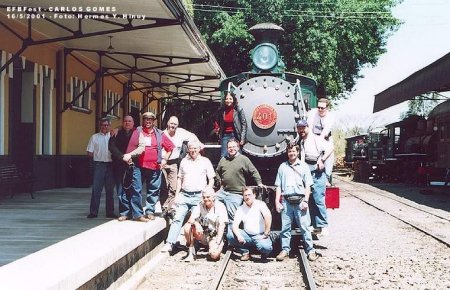 ACIMA: Posando na linha ao lado da estação de Anhumas (eu apareço como o primeiro sentado na frente da locomotiva). Foto Hermes H. Hynuy em 16/5/2001].