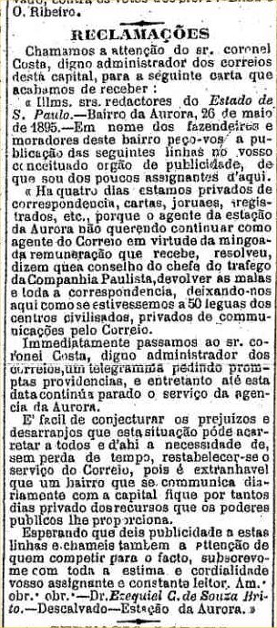 AO LADO: A estação de Aurora já tinha sua agencia de correio, sete meses depois de sua abertura (A Provincia de S. Paulo, 27/10/1891). |