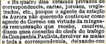 AO LADO: A estação de Aurora já tinha sua agencia de correio, sete meses depois de sua abertura (A Provincia de S. Paulo, 7/8/1889). |