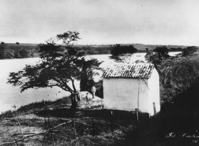 Ayrosa Galvão (velha), município de Jaú, SP Foto da primeira capela de Frei Galvão, por volta de 1910. A linha da Paulista passava atrás da capela. Ao fundo, o rio Tietê. (Cessão Edson Castro, Jaú, SP)