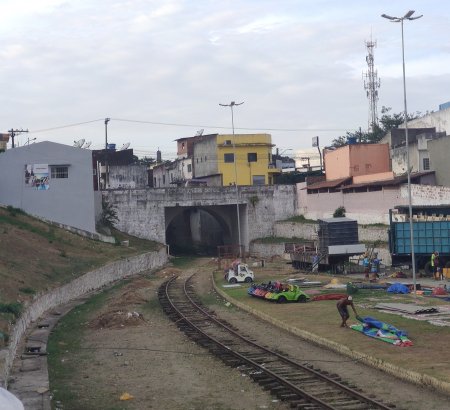 ACIMA: Trecho da antiga linha ainda com trilhos e um viaduto em 2022. Do lado direito, o pátio com um circo (Rodrigo Henrique, 14/02/2022)