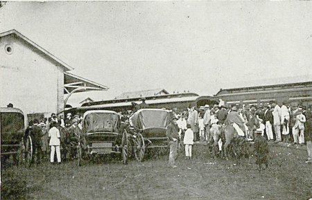 ACIMA: Estação original de Barretos em 1911. Autoridades do governo de São Paulo chegam pelo trem da Cia. Paulista para serem conduzidos pelos tílburis para a cidade onde visitariam o novo frigorífico - que dpois ganharia estação própria (Foto Revista Illustração Paulista, edição de 1911).