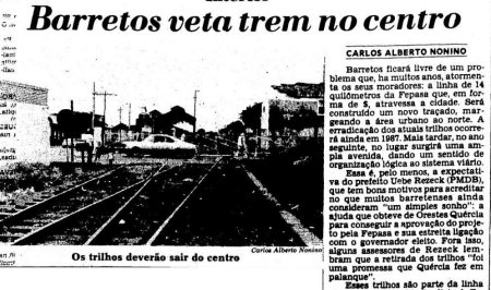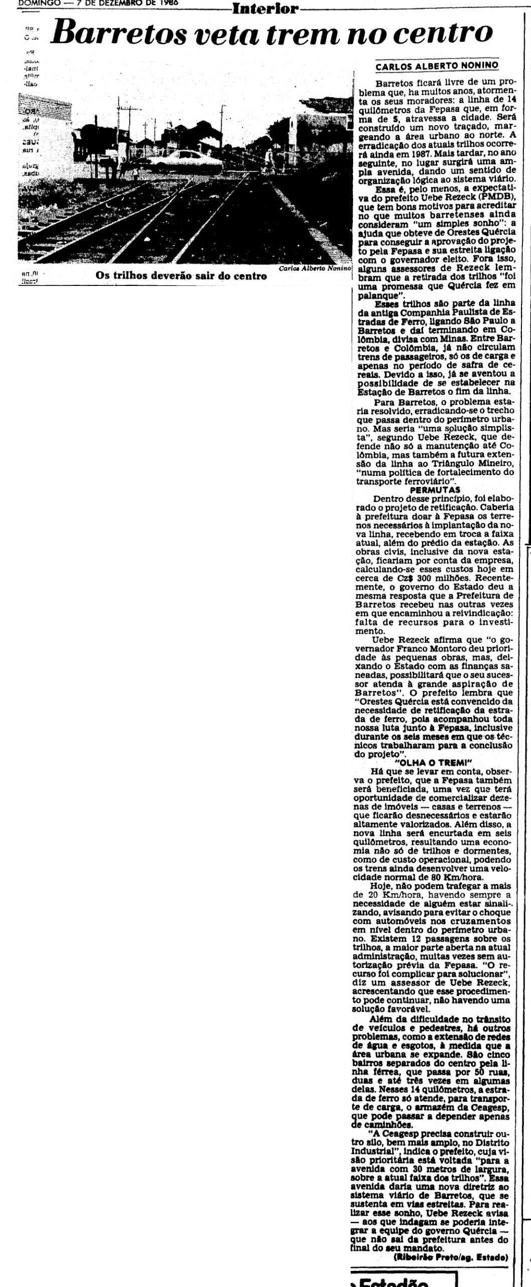 ACIMA: A velha reclamação contra as ferrovias leva a Prefeitura a estudar a retirada dos trilhos do ventro da cidade em 1986. Tal mudança deu-se apenas em 2002, 22 anos mais tarde - CLIQUE SOBRE A FIGURA PARA VER A REPORTAGEM INTEIRA (O Estado de S. Paulo, 07/12/1986).