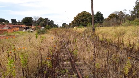 ACIMA: Linha da EFS abandonada e com mato junto à antiga estação em 2019 (Foto Rafael Javaro, 21/7/2019).