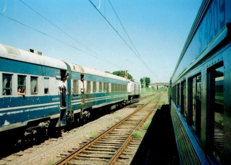 ACIMA: Noa anos 1990, trens de passageiros da larga (ex-CP) à direita e da estreita (ex-CM) na esquerda (Foto Vanderley