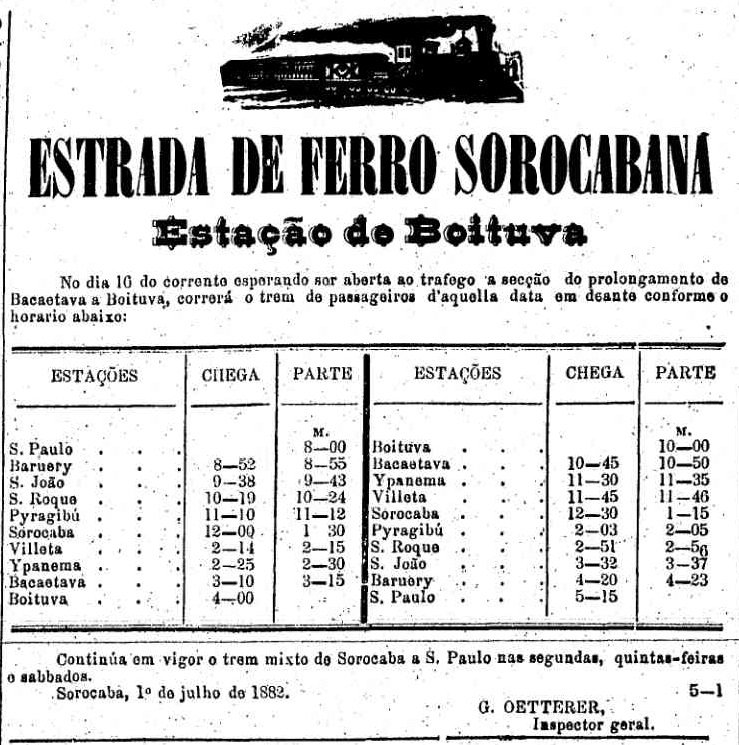 ACIMA: Horário dos primeiros trens para Boituva em 1882, a partir de 10 de julho: eram oito horas de viagem entre São Paulo e Boituva - CLIQUE SOBRE A FIGURA PARA VÊ-LA EM TAMANHO MAIOR) (A Provincia de S. Paulo, 05/07/1882).