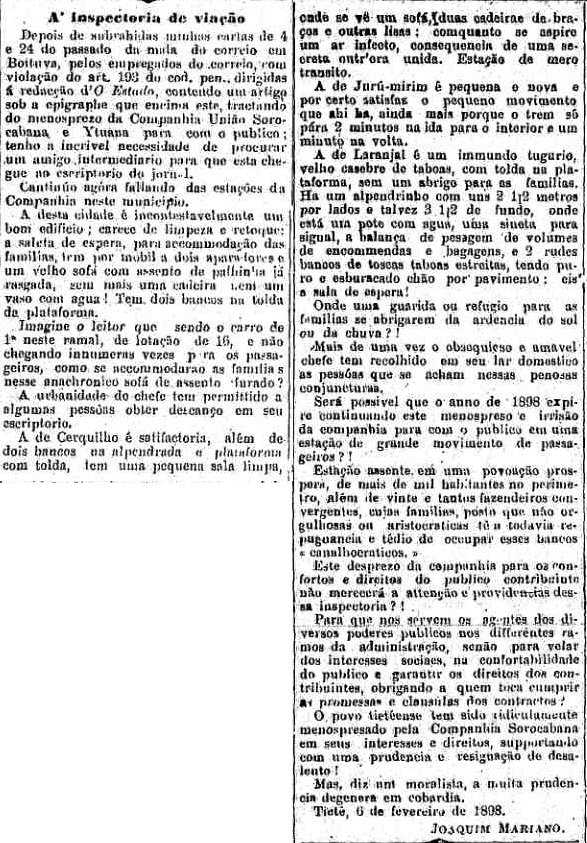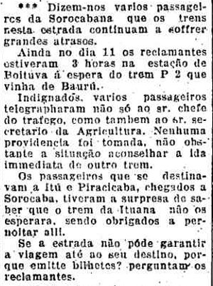 AO LADO: Atrasos da Sorocabana em Boituva e em outras estações da linha geram reclamações dos usuarios (O Estado de S. Paulo, 16/1/1917). |