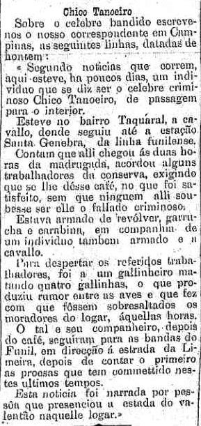 À ESQUERDA: Chico Tanoeiro, temível bandido da época, que havia sido preso e depois fugiu no início de 1898 na região de Botucatu, aparece na estação de Santa Genebra (hoje Barão Geraldo) e toma café. Mas seria mesmo o bandido? Aliás, a estação já estava funcionando nessa época, antes da data de sua inauguração oficial, em 1899?