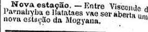 Há divergência na data de abertura da estação: embora conste na Mogiana a data de 6 de dezembro de 1892, ela ainda não teria sido aberta em abril de 1893 (vide caixa abaixo, de 1893).