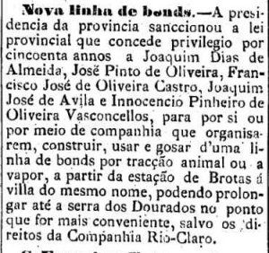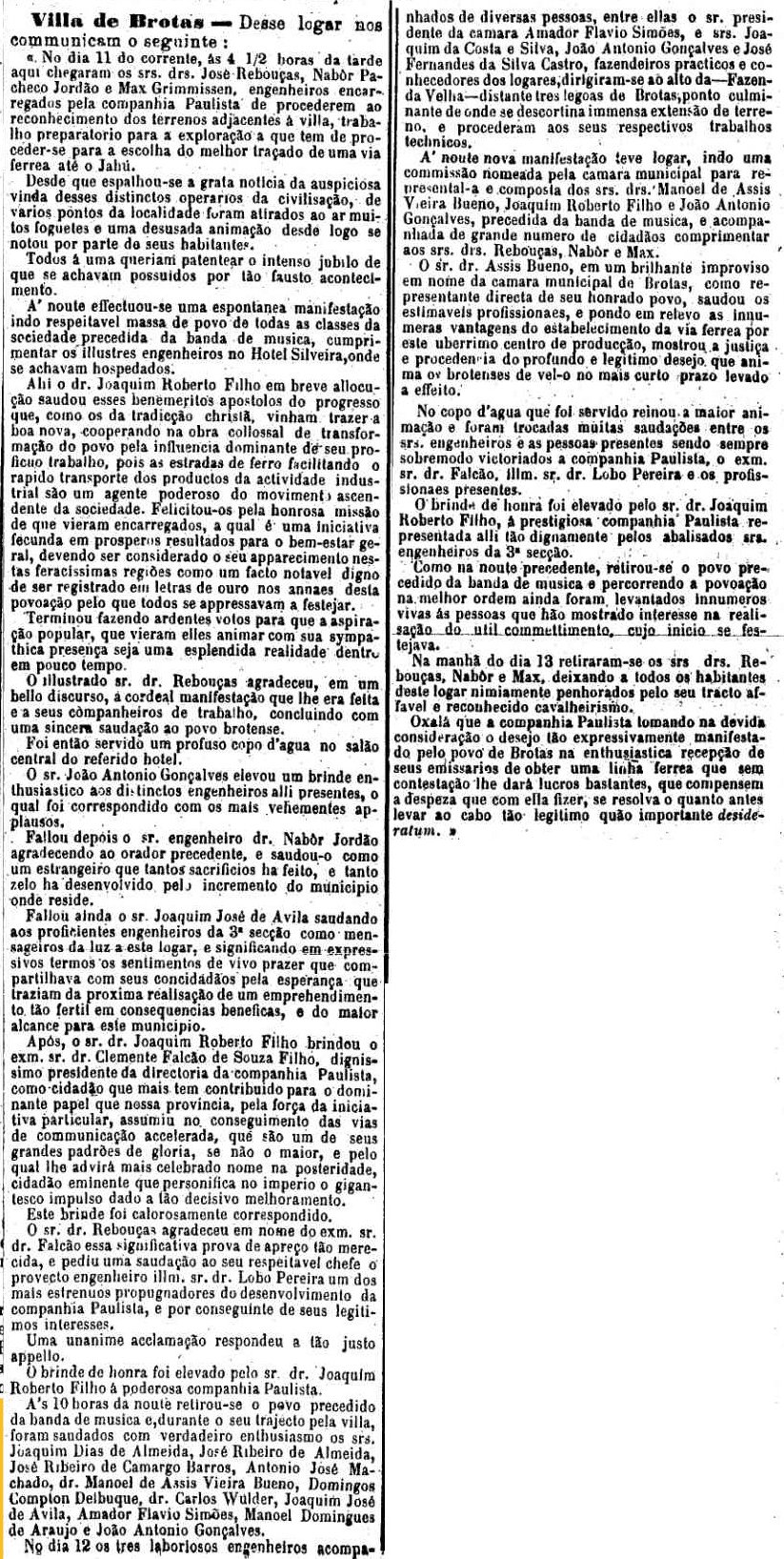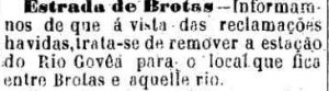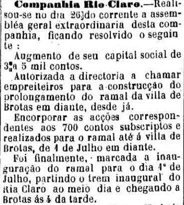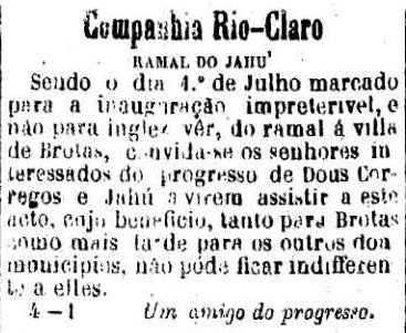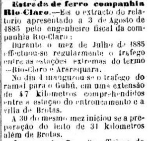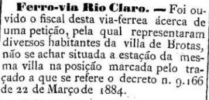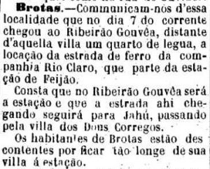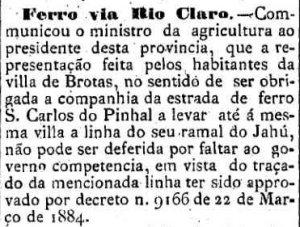 AO LADO: A construção da linha chega até o corrego do Gouveia, em Brotas, e a população reclama da grande distância da cidade (A Provincia de S. Paulo, 15/6/1884). |