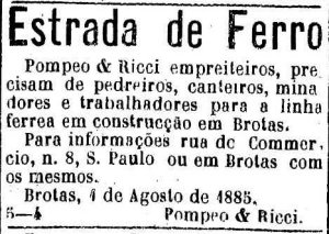 AO LADO: Procura-se homens para construir a linha em Brotas (A Provincia de S. Paulo, 7/8/1885). |
