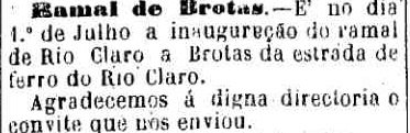 AO LADO: Sequencia de noticias sobre a abertura da estação em Brotas durante o mes de junho (A Provincia de S. Paulo, 28/6/1885). |