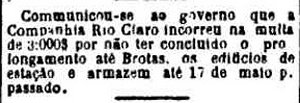 AO LADO: O governador obriga a Rio Clarense a construr uma nova estação em Brotas, desviando a linha do ramal de Jaú para obrigá-la a chegar ao centro de Brotas (na época, limite da zona urbana) (O Estado de S. Paulo,
