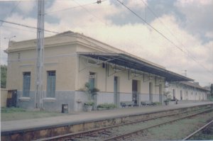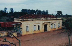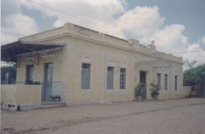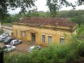 ACIMA; Em primeiro plano, a antiga casa de chaves. Ao fundo, a estação (Foto Victor Hugo Silva em 29/5/2011).