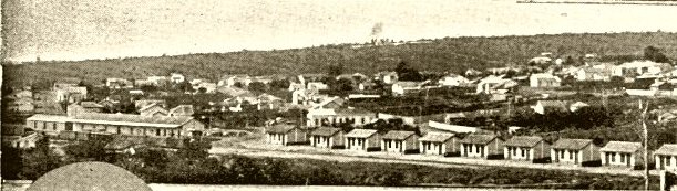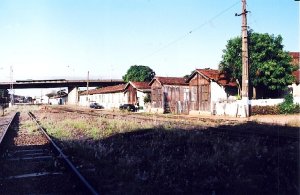 e as casas da vila ferroviária, à direita; ao fundo, a cidade