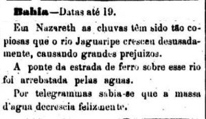 AO LADO: Enxurrada no rio Jaguaripe levou a ponte. Ali a oeste de Onha existiam duas pontes da ferrovia sobre esse rio (O Estado de S. Paulo, 25/11/1875). |
