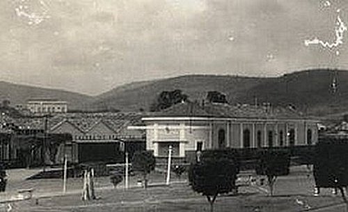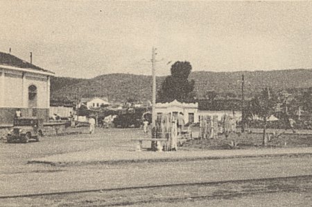 com trilhos da estrada de ferro, ainda ativos na época. A foto