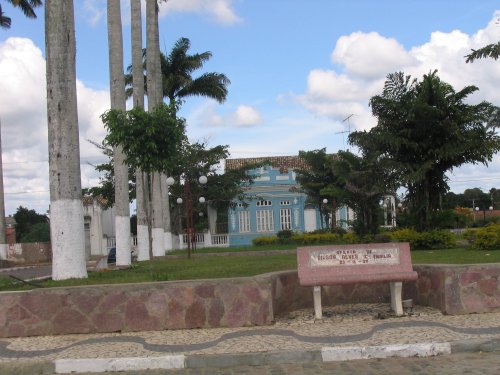 Conceição da Feira, BA Acima, praça em Conceição da Feira, com a bela casa ao fundo e as palmeiras imperiais. Foto de 21/05/2006. (Foto Ralph M. Giesbrecht)