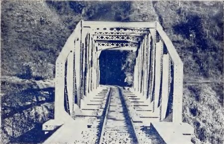 ACIMA: Vista de frente da ponte metálica com 48 m de vão sobre o rio Sergi, na variante Santo Amaro-Afligidos, em 1942 ( Relatório VFFLB, 1942).