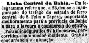 AO LADO: A estação da qual se fala no artigo é na verdade a de Taperi. Erro crasso do jornal paulista. A outra (Tapera) ficava próxima a Feira de Santana, a 39 km de São Felix. (A Provincia de S. Paulo, 21/12/1881). |