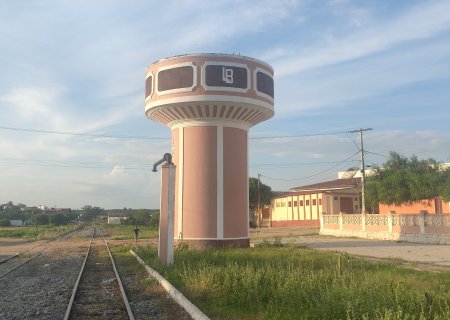 ACIMA: A caixa dagua da estação em 2021 (Foto Rodrigo Henrique em 08/12/2021).