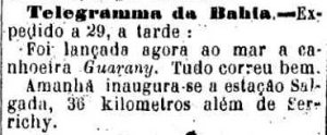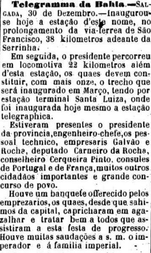 AO LADO: Chamada para a inauguração da estação de Salgada em 30 de dezembro de 1883. A estação que ficava a 36 km antes era a de Serrinha, escrita como "Serichy".Bem mais tarde foi construída uma estação que ficava entre elas (Agenor de Freitas). (A