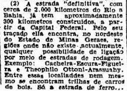 AO LADO: Na discussão existente nesta época sobre a ligação do Sul com o Norte do Brasil por rodovia, o trecho Teofilo Ottoni a Araçuaí era impossível de ser feito por carros ou por ferrovia, esta só chegaria à cidade dois anos depois (O Estado de S. Paulo, 30/11/1940). |