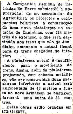 À ESQUERDA: O dia em que inauguraram a passagem inferior o pátio de Campinas e outras estações também foram reformadas (O Estado de S. Paulo, 15/06/1920). |