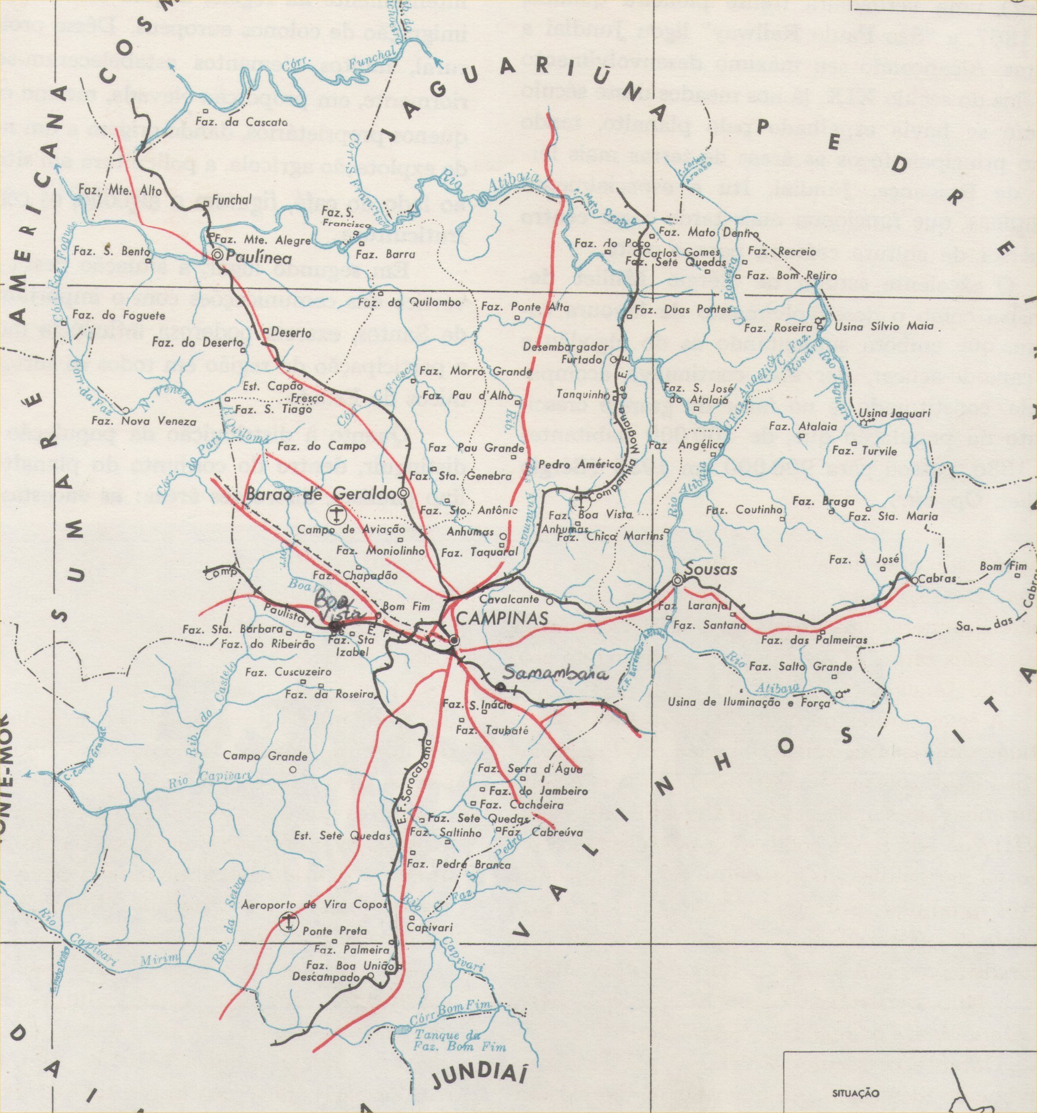(linhas vermelhas) de Campinas em 1958. A linha que cruza o