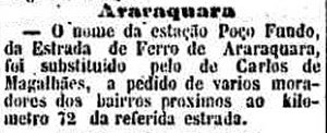 AO LADO: É anunciado que em maio de 1901, a estação de Poço Fundo recebeu um novo nome (Carlos Magalhães). (O Estado de S. Paulo. 25/05/1901). |