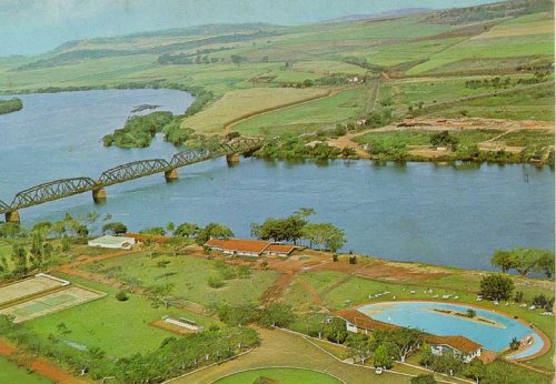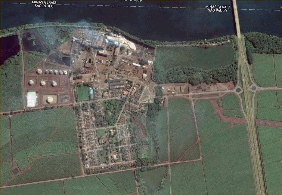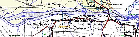 ACIMA: O rio Grande, fronteira de São Paulo (sul) com Minas Gerais (norte), a localidade de Coronel Quito (centro), a estação, junto ao rio em território paulista aparece a centro-direita e a linha da Mogiana, vinda de Igarapava pela direita. As outras linhas são os ramais da usina (IBGE, anos 1970).
