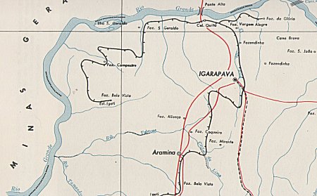 ACIMA: Mapa dos anos 1950 mostra a linha da Mogiana vinda do sul para Igarapava e Coronel Quito e também os ramais das fazendas da região (Foto dos anos 1950, IBGE).
