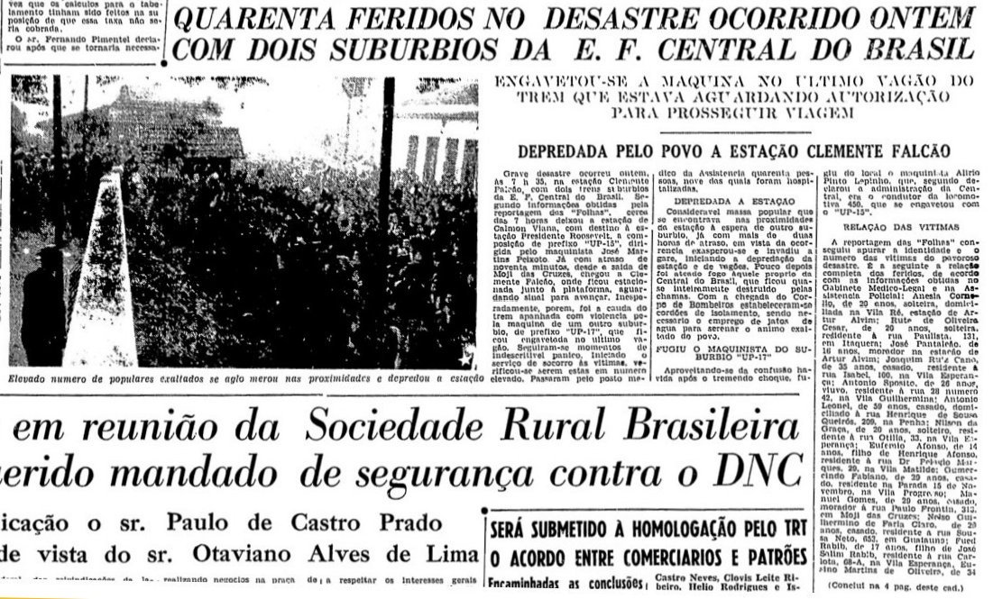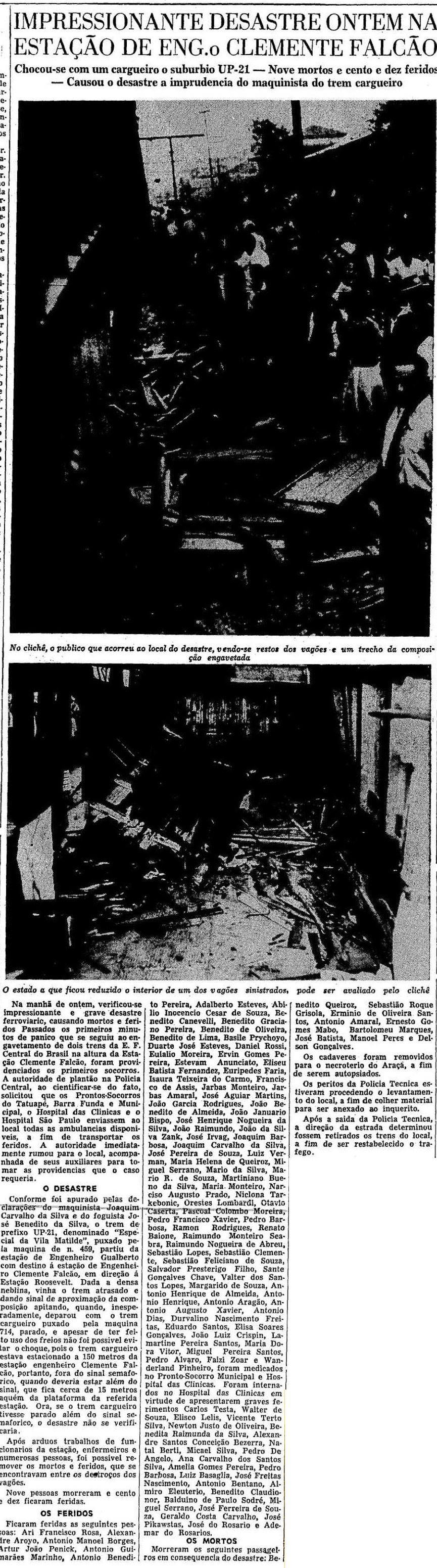 ACIMA: Infelizmente com uma péssima reprodução das fotos, mais um desastre, desta vez\ em 1959, com mortos em Clemente Falcão. Qual seria o problema de haver tantos desastres nesta estação em vinte anos? - CLIQUE SOBRE A FOTO PARA LER A REPORTAGEM INTEIRA (O Estado de S. Paulo, 10/09/1959).