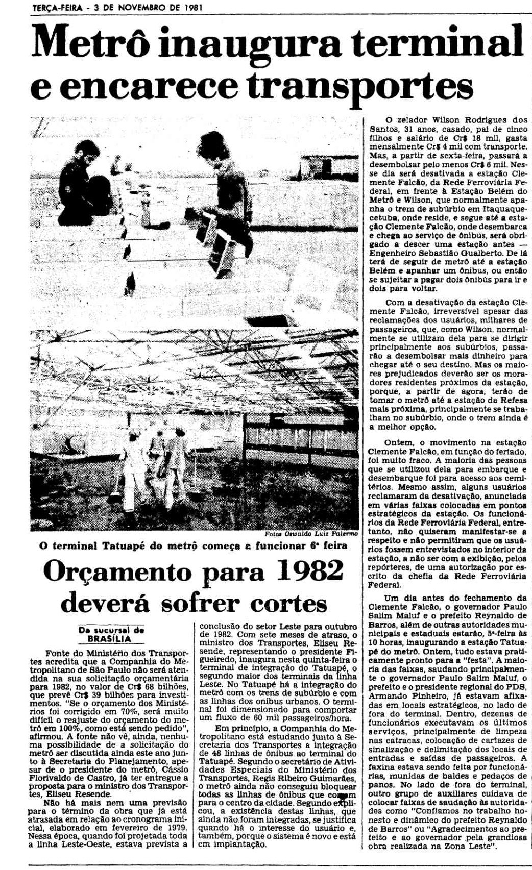 ACIMA: A estação de Clemente Falcão será fechada no dia 5 de novembro de 1981 e provoca reclamações dos usuários - CLIQUE SOBRE O ARTIGO PARA VER A REPORTAGEM INTEIRA (O Estado de S. Paulo, 3/11/1981).