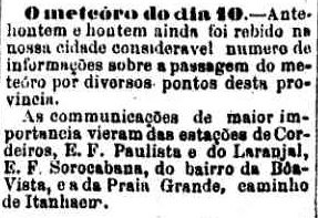 AO LADO: Um meteoro "voando baixo" assusta a população do interior de São Paulo, como aconteceu na estação de Cordeiro (A Provincia de S. Paulo, 16/4/1889). |