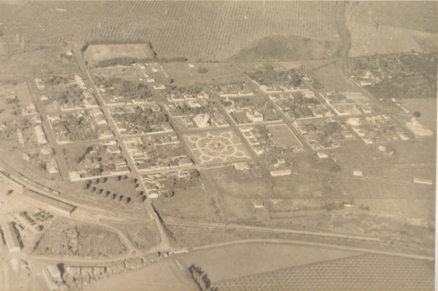 ACIMA: Vista aérea de Cordeiropolis no final dos anos 1930. A estação e o pátio estão no