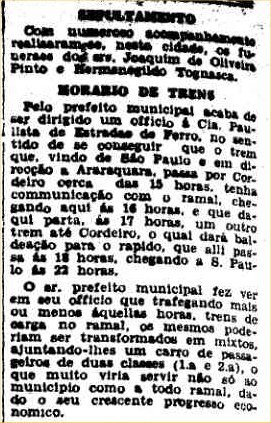 AO LADO: Horario do trem em Cordeiro desagrada o prefeito (O Estado de S. Paulo, 24/11/1939). |