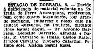 AO LADO: Carregamentos da região da estação de Dobrada vão ser feitos em Motuca, estação próxima e da Cia. Paulista (O Estado de S. Paulo, 07/08/ 1909).