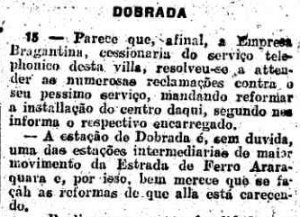 AO LADO: Estação precisa de reformas e o serviço telefonico da cidade é ruim (O Estado de S. Paulo, 18/12/1915). |