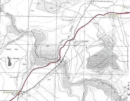 ACIMA: A posição da estação de Francisco Maximiniano em 1974, no canto superior direito do mapa. Tambám aparece a estação de Domingos Villela, no canto inferior esquerdo do mapa. O rio que cruza o mapa de noroeste a sudeste é o ribeirão da Onça (CLIQUE SOBRE O MAPA PARA VÊ-LO EM TAMANHO MAIOR) (IBGE) |