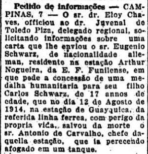 AO LADO: Jovem é herói na estação de Guaiquicuá (O Estado de S. Paulo, 11/4/1924). |