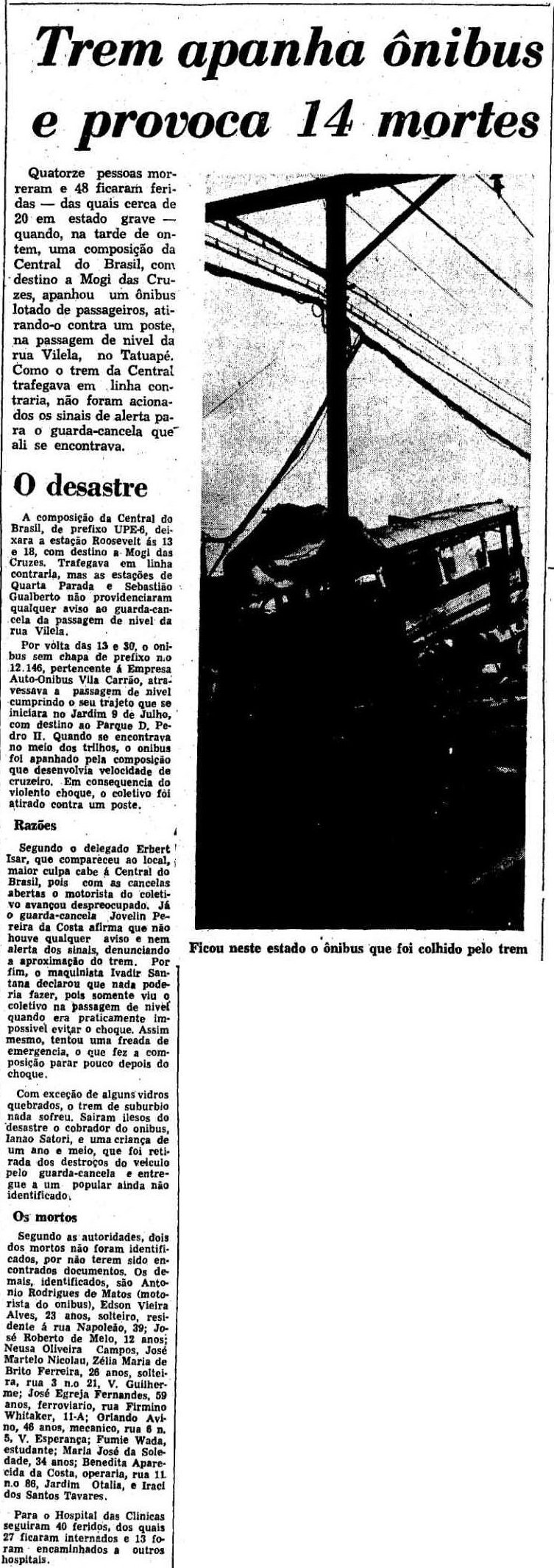 AO LADO: Mais um acidente na antiga queda de passageiro na 5a parada (Engenheiro Gulberto) - CLIQUE SOBRE O TEXTO PARA VER O TEXTO INTEIRO (O Estado de S. Paulo, 04/03/1966). |