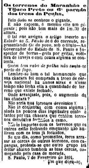 AO LADO: Disputa por terras na região da Sexta Parada mostra que a estação já existia neste ano - CLIQUE SOBRE O ARTIGO PARA VÊ-LO INTEIRO (O Estado de S. Paulo, 13/02/1891). |