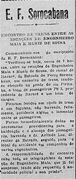 AO LADO: Choque de trens na ponte sobre o rio Pirituba, próxima à estação de Engenheiro Maia (Correio Paulistano, 25/5/1926). |
