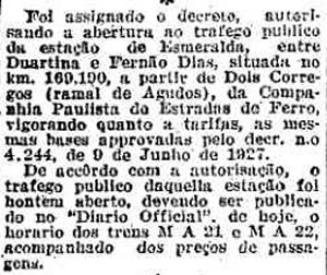 A ESTAÇÃO: A estação de Esmeralda foi inaugurada em 1928 (ver caixa abaixo, de 1928).