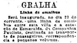 AO LADO: Onibus para ligar a estação de Esmeralda ao distrito de Gralha - atual município de Lucianópolis