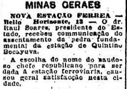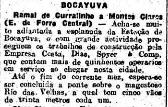 AO LADO: A estação de Bocaiuva já estava em construção 11 anos antes de sua inauguração. O que teria causado tanto atraso na obra dela e do trecho de Montes Claros? A Guerra Mundial? (O Estado de S. Paulo, 29/3/1913). |